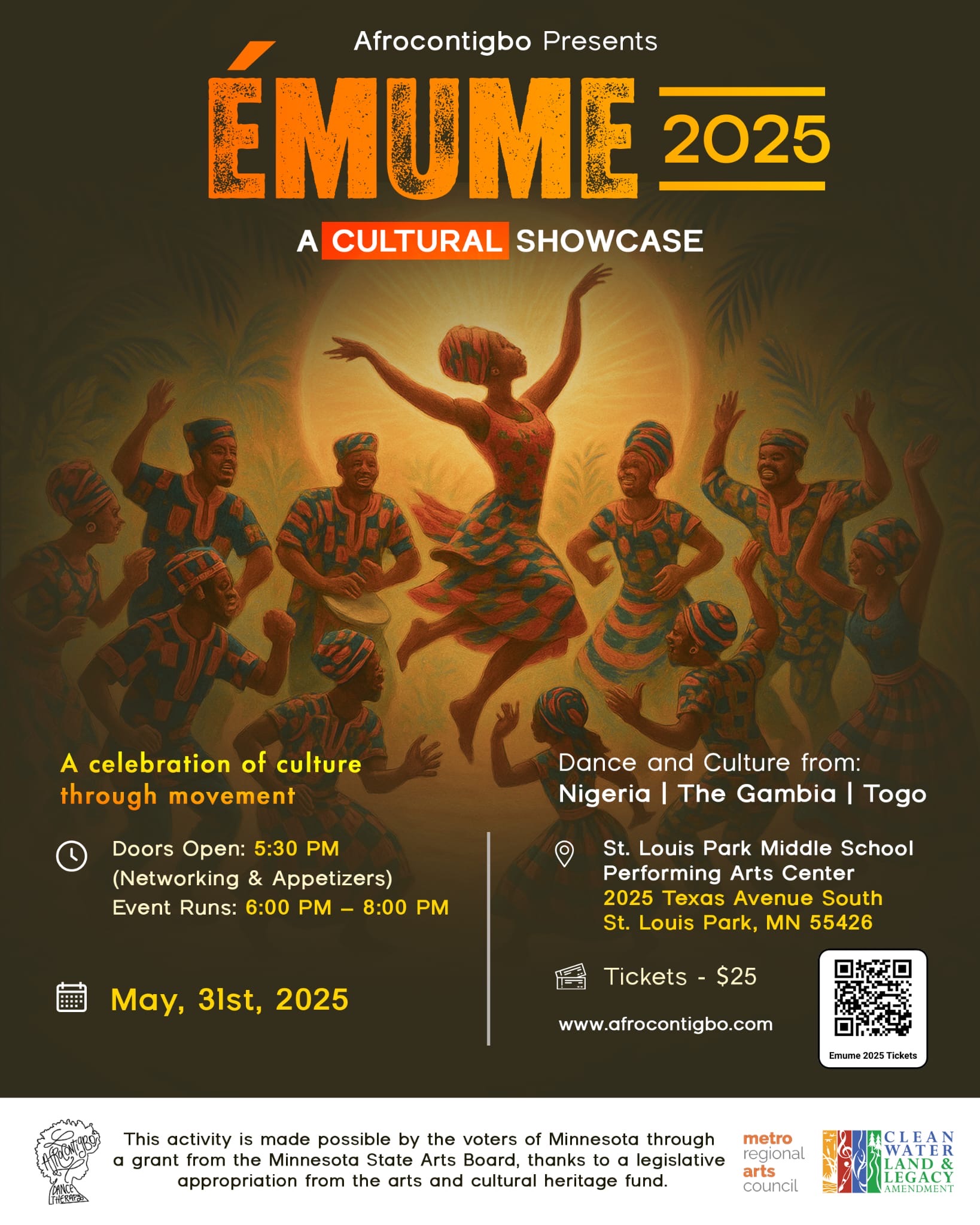 Join us for Émume 2025, a powerful celebration of culture through movement. This vibrant evening highlights the dance, music, and spirit of Nigeria, The Gambia, and Togo, brought to life by performers of all ages, including members of the Afrocontigbo professional dance company and members of the community. Embodying the richness of our cultural fabric, this event will also include a tour of foods from Nigeria, Gambia and Togo, visual art, a raffle, audience participation and networking.