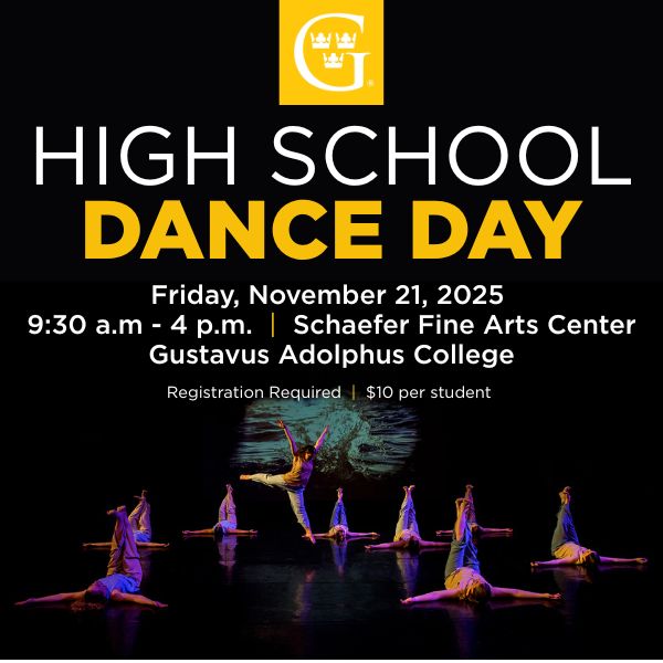 The Department of Theatre and Dance at Gustavus Adolphus College is offering a day of dance master classes for high school students (grades 9-12) taught by Gustavus Dance faculty. Students with experience and no experience are welcome to participate. You can find the schedule, more details, and a link to register below.